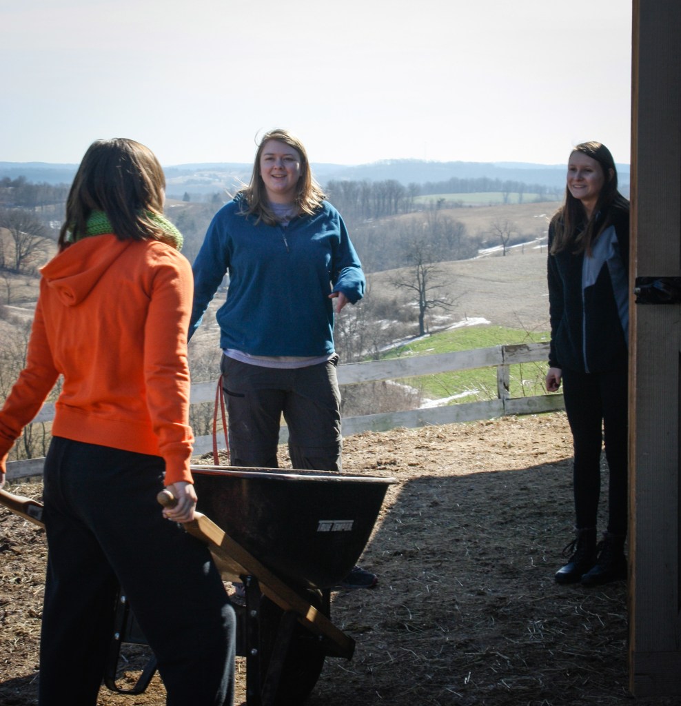 Volunteers Lindsay Varner and Tia Kissinger look less confident about mucking stalls than Amy Van Tassel.