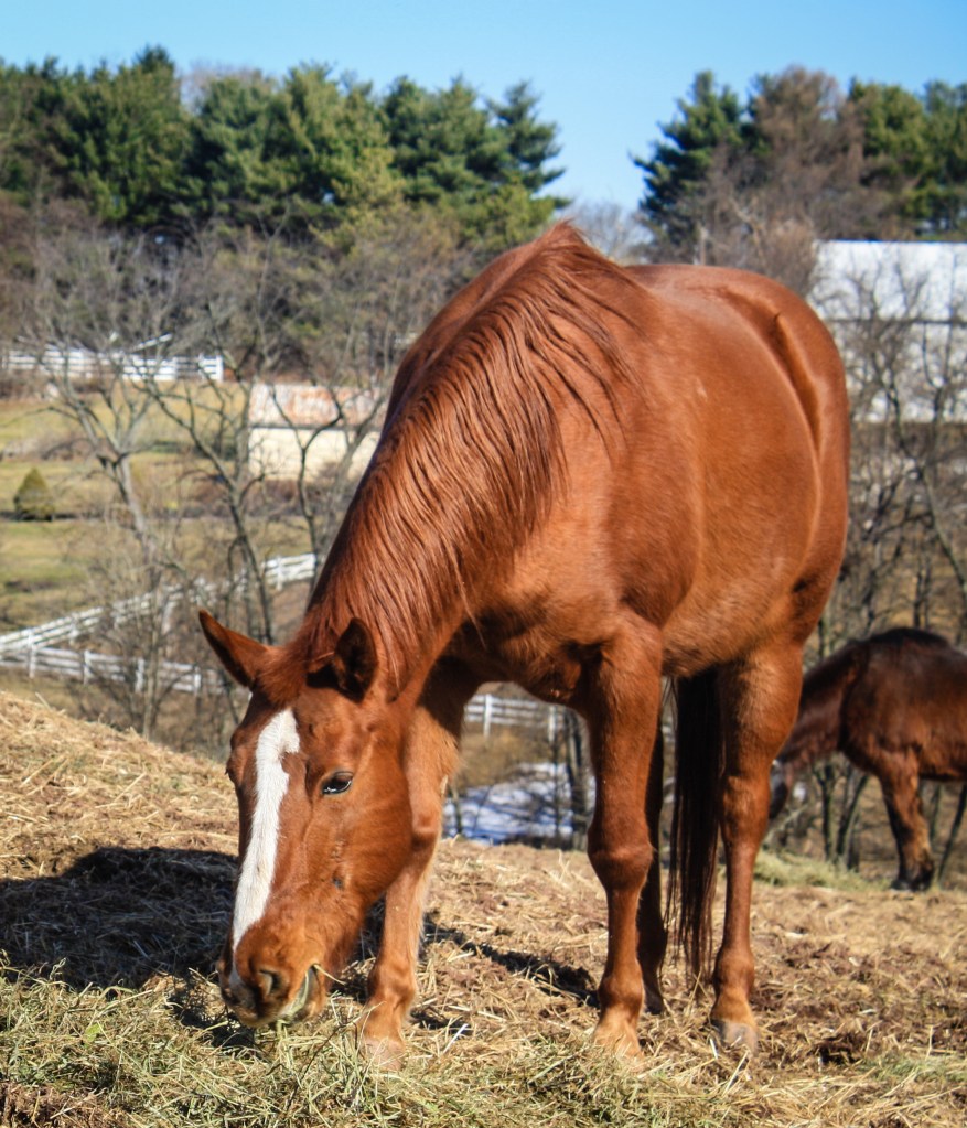 Summer relishes some pasture time. Scars are visible on her cheek from her car accident.